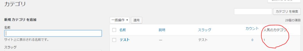 下の写真のように人気のカテゴリなどのカスタムフィールドの値を管理画面のターム一覧に表示することができます。